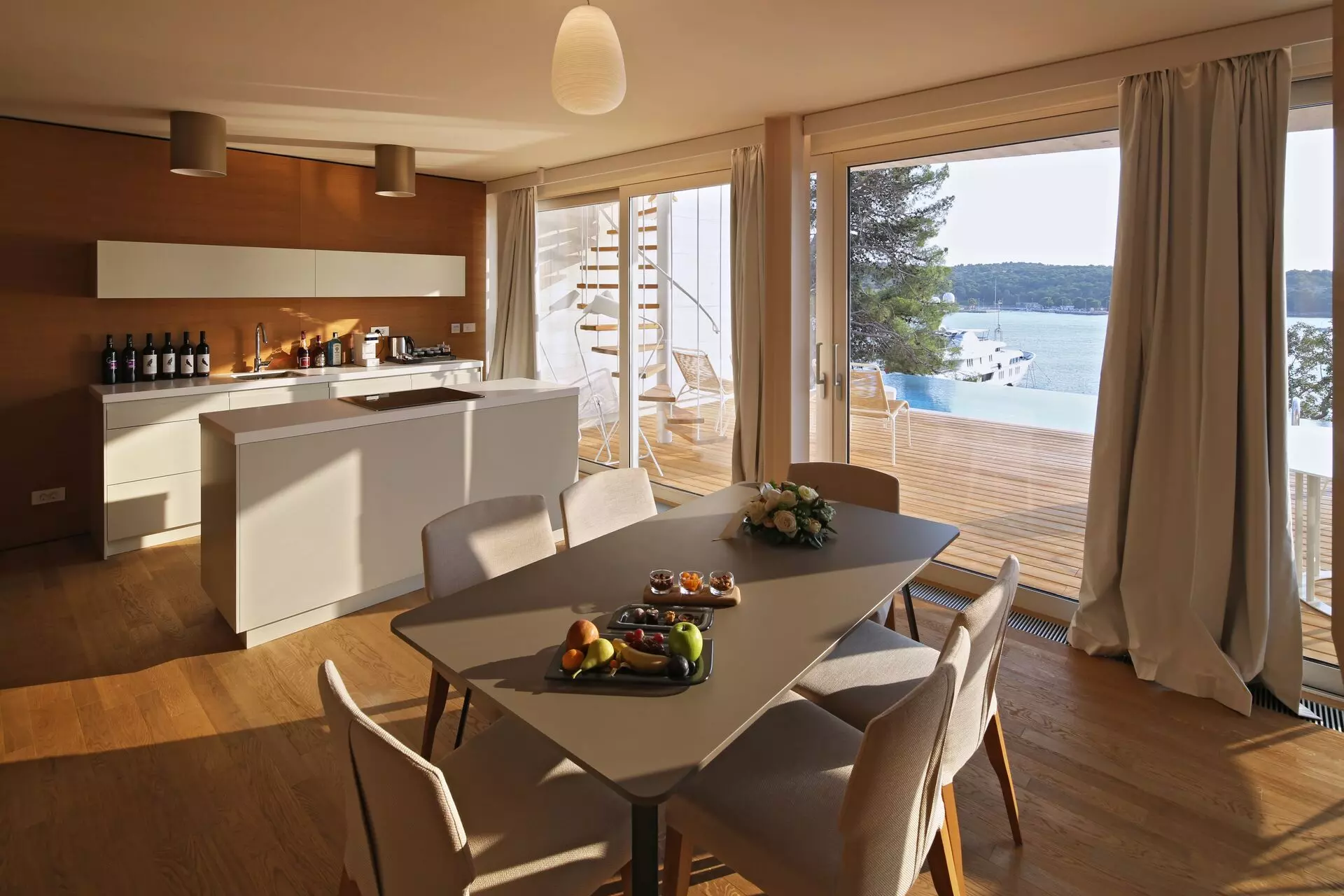 The most important spatial feature of the project is the fluid boundary between interior and exterior: the exterior enters the building, while the interior often extends beyond its physical limits. Frames of the Mediterranean landscape thus become part of the interior, while wooden linings—along with fittings and lighting—extend outward to shape the exterior. This spatial concept is particularly well suited to the Mediterranean climate and lifestyle.