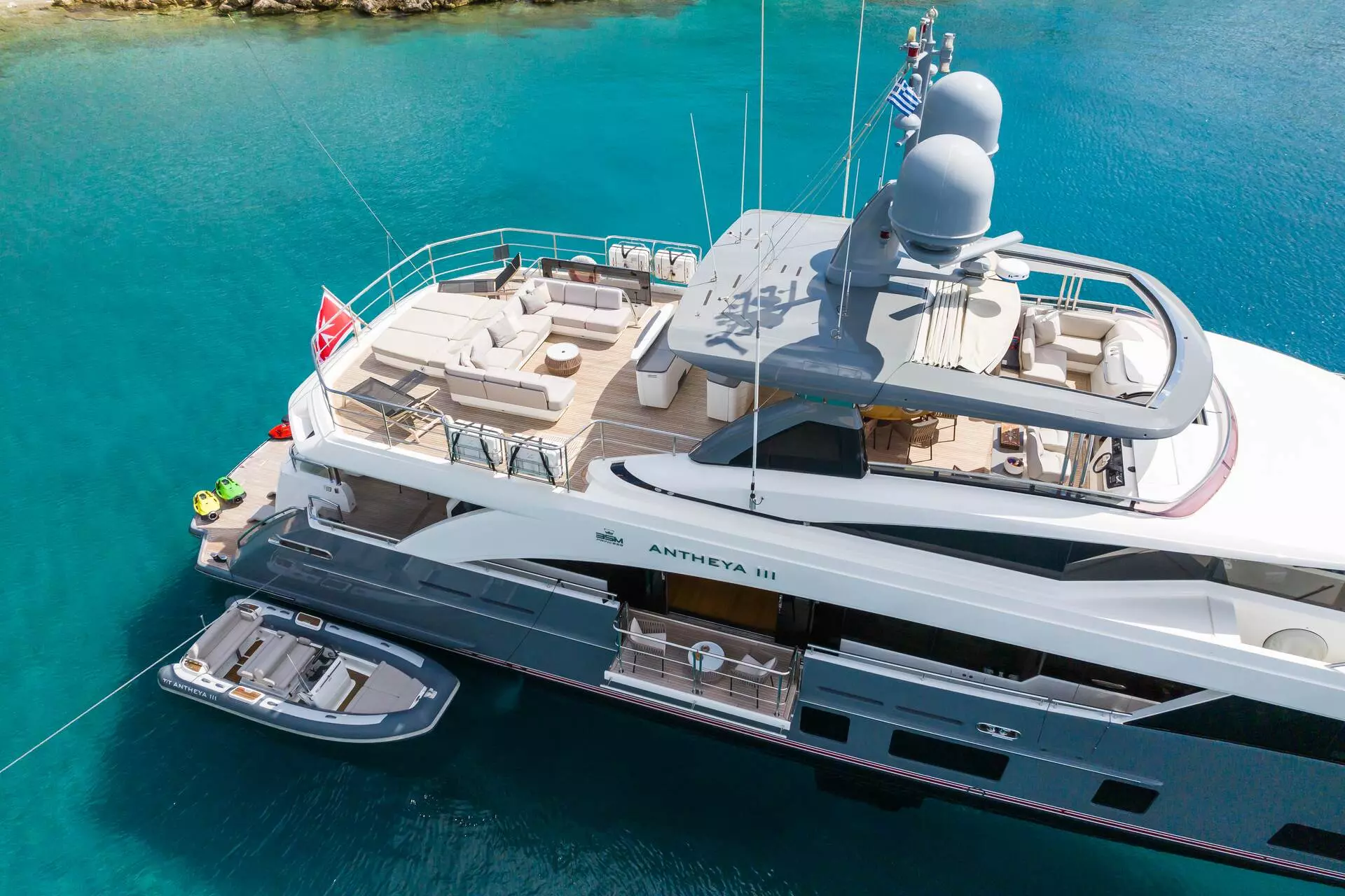 Antheya III es perfecto para relajarse, cenar o entretenerse con amigos y familiares. Los huéspedes pueden disfrutar de una variedad de juguetes acuáticos, añadiendo diversión y aventura a cada parada en el camino.